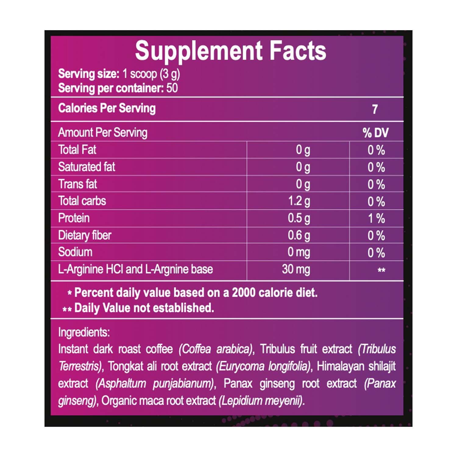 Café tostado oscuro instantáneo (Coffea arabica), extracto de fruto de Tribulus (Tribulus terrestris), extracto de raíz de Tongkat ali (Eurycoma longifolia), extracto de shilajit del Himalaya (Asphaltum punjabianum), extracto de raíz de Panax ginseng (Panax ginseng).